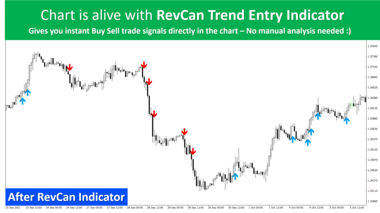 Stressful manual chart analysis days are over. Install RevCan on MT4 or MT5, reload the platform, and immediate signal indicator for MT4 / MT5 trading signal indicator arrows highlight high-probability entries while push alerts keep you one step ahead.