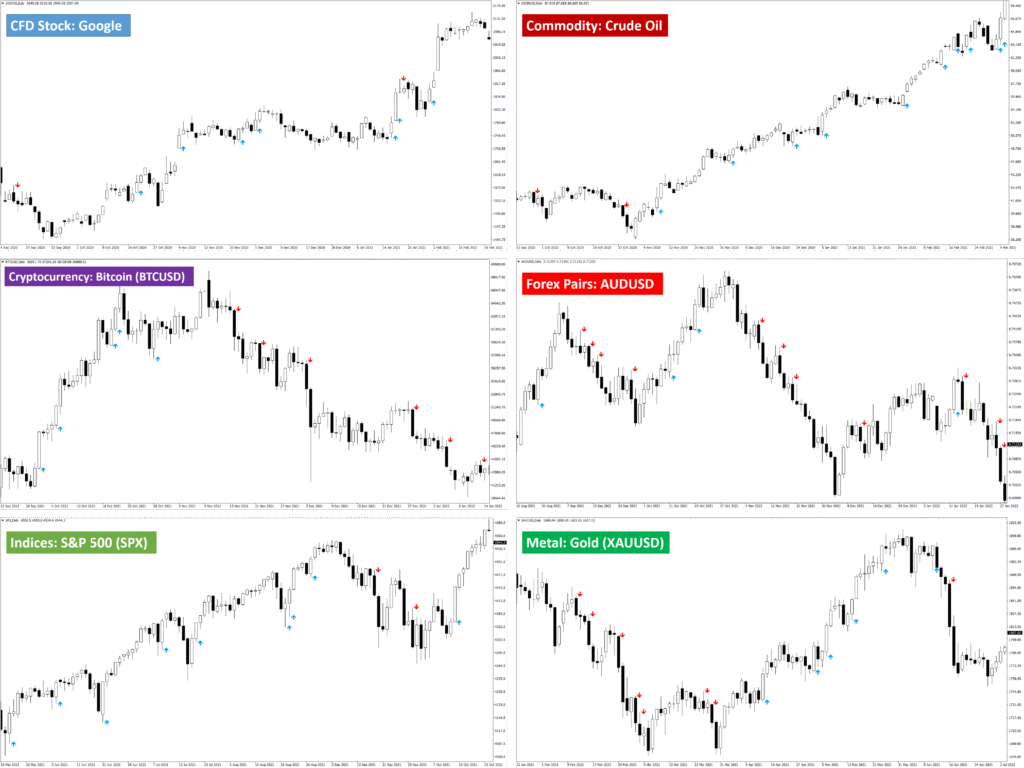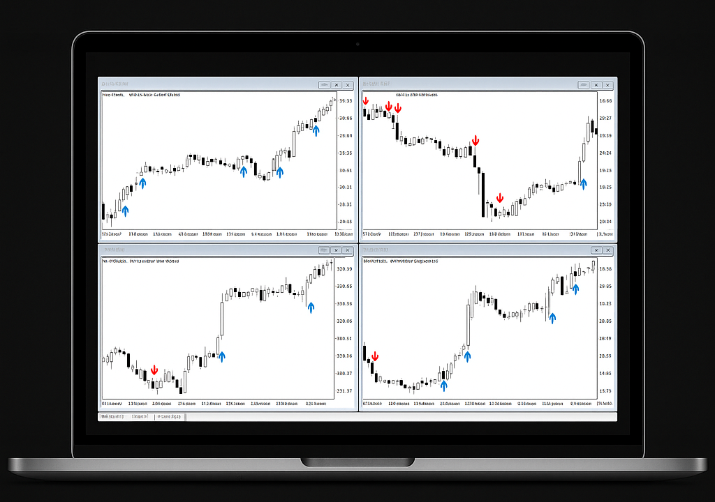 RevCan’s trading signal analyzer software scans forex majors, global equities, Bitcoin, gold, oil and indices-all from a single dashboard. Browse the gallery below to see identical arrow logic on Google stock, crude-oil futures and AUD/USD.